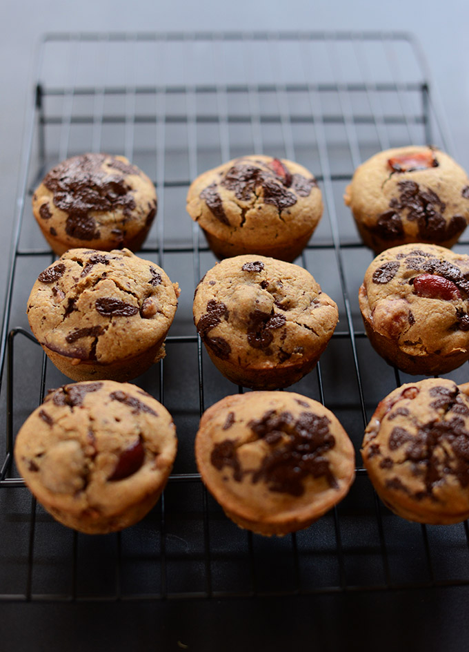 Spoon into 9 greased or paper-lined muffin tins and top with remaining chocolate (amount as original recipe is written // adjust if altering batch size). They will be full; just the way I like them.