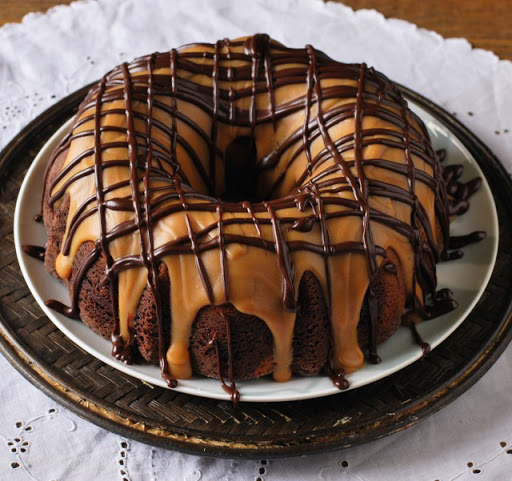 Pour a small amount of chocolate batter into the prepared bundt pan. Dot with large spoonfuls of peanut butter batter, and top with more chocolate batter. Continue alternating until all the batter is in the pan. Bake @ 350 for 1 hour or until a toothpick inserted in the center comes out clean. Cool completely.