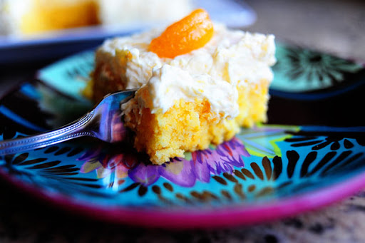 To serve, cut cake into squares and top each square with a mandarin orange slice.