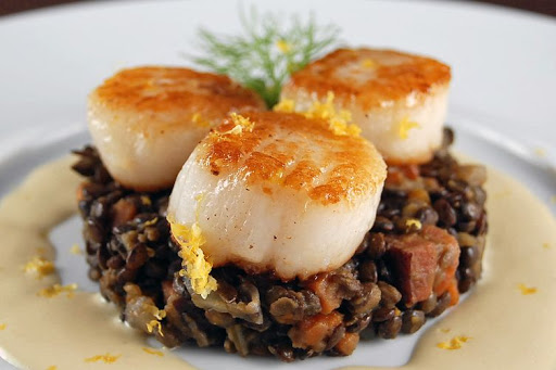 You can also make the fennel cream while the lentils are cooking. In a medium saucepan over medium-low heat, cook garlic, fennel, fennel seed, and shallot in a little olive oil until translucent. Add the wine, turn up the heat and reduce until almost all the liquid is gone. Add the stock and reduce in the same manner. Add the cream and reduce by half, remove from heat and let cool slightly. Pour the cream into a blender and mix on high until very smooth. Pour through a fine mesh strainer into a small pan, season to taste with salt and pepper and cover to keep warm.