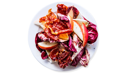 Toss chicories, apple, and dressing in a large bowl; season with salt and pepper. Serve salad topped with fried prosciutto.