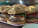 While burgers cook, sliced cheese and tomatoes, onions and basil and reserve.