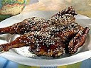 Remove neck, giblets and cut away excess fat from 1 whole roasting chicken. Take a pair of kitchen sheers and cut along both sides of backbone to remove it. Turn chicken skin-side up and press down between the breasts to break the keel bone. This will allow the chicken to lay very flat on grill and cook quickly.