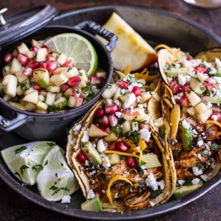 Chicken Tacos-Spicy Cider Beer Braised w/Sweet Chili Apple-Pomegranate Salsa.