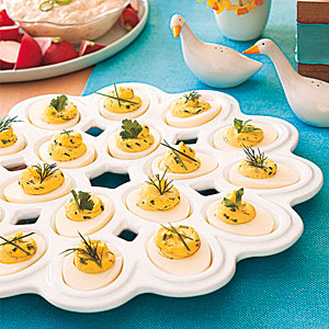 3. Using a teaspoon or a pastry bag fitted with a star tip, fill egg white cavities with yolk mixture. Sprinkle herb garnish over eggs, if desired. Serve immediately, or cover and refrigerate for up to 24 hours (garnish with herbs just before serving).