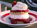 On a serving platter, place 1 shortbread cookie face up, top with a spoonful of raspberry compote, a dollop of whipped topping, and place a second cookie (or other half of shortbread biscuit) on top. Garnish with a dollop of whipped topping, several raspberries and orange zest.