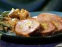 Season the stuffed and tied pork loin with salt and pepper. Sear the pork loin in vegetable oil in a large Dutch oven over medium-high heat, turning to get all the sides. Pour the apple cider over the pork. Roast uncovered for about 1 hour and 20 minutes or until an instant-read thermometer inserted into the center of the roast registers155 degrees F.