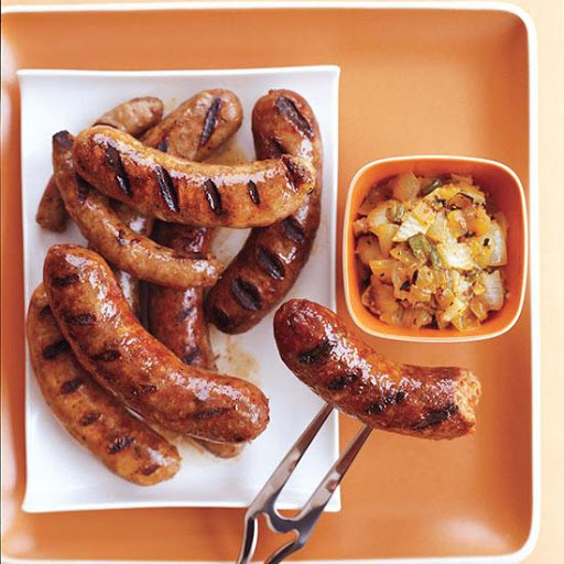 Grill the sausages over a medium-high fire until golden and cooked through, 10 to 12 minutes. Serve the sausages with the grilled-onion chowchow.