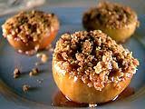 Cut each apple in half along its equator. Using a melon baller, cut out each side of the core, creating a rounded hole. Rub exposed apple flesh with lemon juice. Place 1 tablespoon of jam into each hole. For the topping: in a small bowl mix together flour, butter, brown sugar, oats, cinnamon and salt. Press this mixture on the top of each apple, covering jam. Place in a baking dish filled with about a 1/4-inch of water. Bake until top is golden brown and apple is tender, about 35 to 40 minutes.