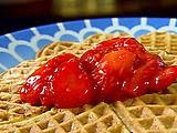 Serve waffles with powdered sugar and strawberry sauce.