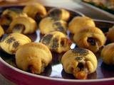 Roll out 6 of the crescent pastry rolls and slice in half forming 2 triangles and 12 pieces total. To assemble, place a piece of salami and cheese on 1 triangle. Add a dollop of the onion mixture in the center. Starting at the wider edge, roll the crescent triangle to form a small croissant. Place seam side down on a baking sheet. Repeat with remaining ingredients. Sprinkle poppy seeds over each roll and bake for 13 to 15 minutes or until golden brown.