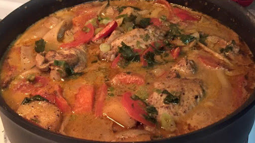 6. Bring to a simmer to finish cooking chicken and vegetables but the less the coconut milk cooks, the better.