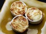 Spoon the stew into 2-ounce serving cups and top each with 1 to 2 tablespoons of mashed potatoes. Brush potatoes with butter and place into oven for 7 to 8 minutes or until mashed potatoes are browned. Garnish with herbs and serve immediately.