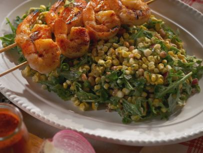 Season the salad with salt and pepper, then transfer to a serving plate and place the shrimp skewers on top of the salad to serve.