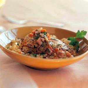 Add onions, carrot, ham, and garlic to pan; sauté 4 minutes or until lightly browned. Stir in broth and wine, scraping to loosen browned bits. Return chicken to pan; bring to a boil. Cover, reduce heat, and simmer 10 minutes or until chicken is done. Remove chicken from pan with a slotted spoon; keep warm. Add whipping cream; cook, uncovered, over medium heat 8 minutes. Spoon 3/4 cup orzo onto each of 4 plates. Top each with 1 chicken breast half, 1/3 cup sauce, and 1 tablespoon parsley. Garnish with parsley sprigs, if desired.