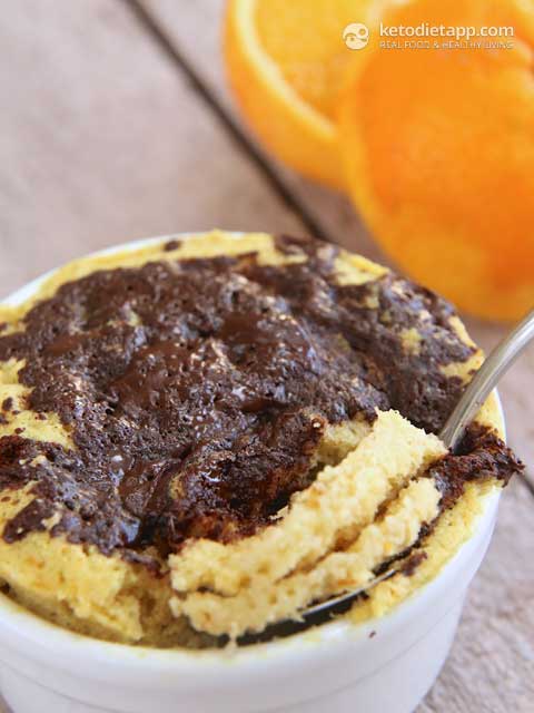 Place all the dry ingredients in a mug or a ramekin and combine well. Crack in the egg, add the coconut oil, and freshly grated orange peel. Add stevia and mix well. Top with dark chocolate chips or chopped dark chocolate.Microwave on high for 30 seconds. Use a spoon and give the chocolate topping a little whirl. Place back in the microwave for another 40-60 seconds.