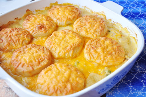 Return casserole to oven and bake until biscuits are golden brown and sauce is bubbly, usually about 20 minutes longer.