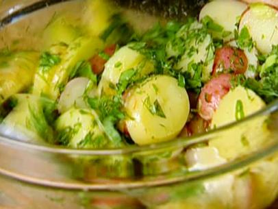 Combine the vinegar, mustard, 1/2 teaspoon salt, and 1/4 teaspoon pepper and slowly whisk in the olive oil to make an emulsion. Add the vinaigrette to the potatoes. Add the scallions, dill, parsley, basil, 1 1/2 teaspoons salt, and 1/2 teaspoon pepper and toss. Serve warm or at room temperature.