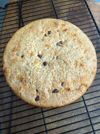 Preheat the oven to 350°F (180°C). Grease an 8-inch round cake pan and line with parchment paper; set it aside. In a large mixing bowl, beat eggs on high until fluffy and airy (about 3 minutes). Add in the coconut sugar and beat on medium for 1-2 more minutes. Add in the almond butter and vanilla. Mix on low until well combined. Pour the batter in your prepared pan and sprinkle on the chocolate chips and coconut flakes. Bake for 20 to 25 minutes, or until the center is set.Remove the cake from the oven and cool for ten minutes before inverting onto a wire rack. Serve warm. Store in an airtight container for up to three days.