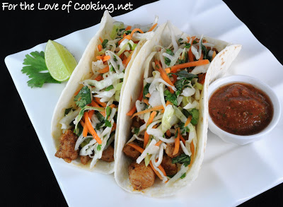 Place the cooked pork into the warmed flour tortillas and toss with the tangy slaw. Serve with a side of homemade salsa. Serve immediately. Enjoy.
