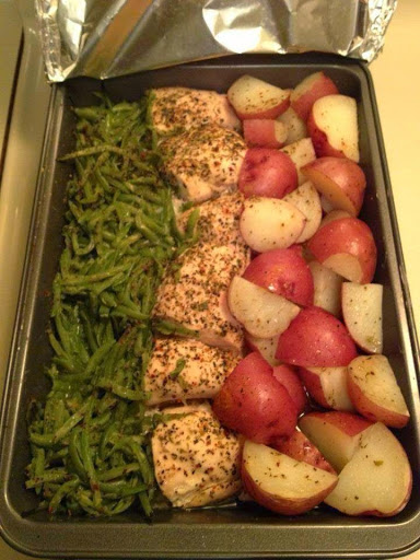 In a 9x13 pan, cut 3 chicken breasts in half, add 2 cans green beans on one side and cut up red skin potatoes on the other. Sprinkle a packet of zesty Italian dressing mix over the top. Drizzle the melted butter over it.