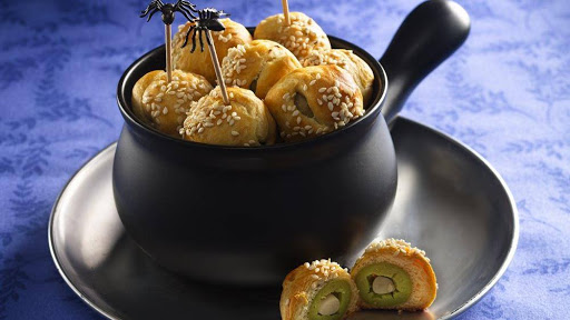 Place 1 olive on each strip. Wrap dough strip around olive. Roll between palms of hands until olive is completely covered with dough. Place on cookie sheet. Brush milk over top of each bite; sprinkle sesame seed over top of each.