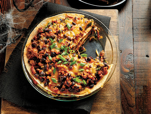 Assemble lasagna by placing a tortilla on the bottom of pie plate. Spread 11/3 cups mixture in a layer over tortilla. Scatter remaining 2 cups spinach, then 2/3 cup of cheese overtop, pressing down on the tortilla as you layer. Repeat.
