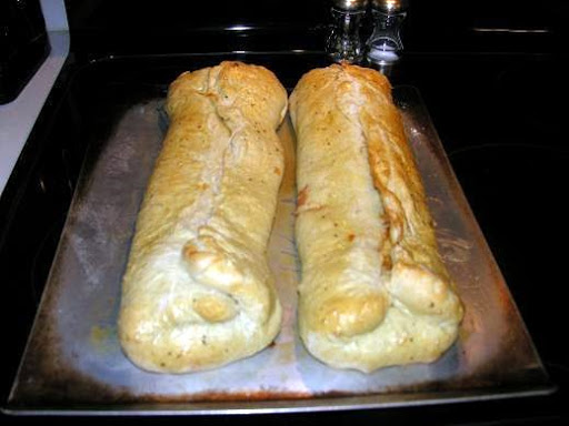 Set out frozen bread dough on a greased cookie sheet. Cover with butter sprayed plastic wrap. Thaw bread dough and let rise over night. Roll out and top with egg & oregano mixture, meat of choice and cheese. Roll up and brush with remaining egg mixture. Bake at 350 degrees until golden brown. 30-35 mins. Bake 2 on a cookie sheet at a time.