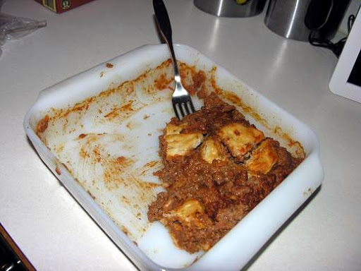 Brown hamburger with onion and drain. Mix in tomato sauce, chili powder, garlic powder, cheese soup and egg.