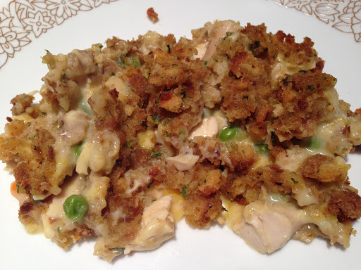 Put cream of chicken soup, sour cream and milk in the bottom of a sprayed 9x13 dish. Boil Chicken until white and drain. Add Rotisserie chicken or boiled chicken to the top of soup mixture. Add Veggies (if you want too) and then top with stuffing mix (already made).