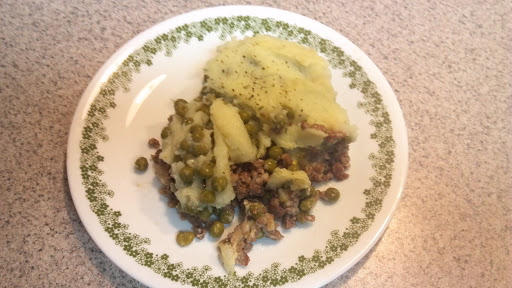 Cook ground beef, drain, put in bottom of pan or casserole dish, layer peas on top of that, then put sliced cheddar cheese for the next layer, top with mashed potatoes and bake for 20-30 min.