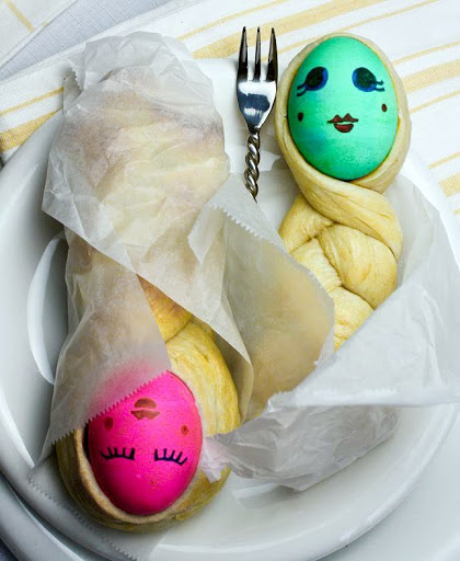 Heat oven to 375 degrees. Using 3 pieces per doll, roll into 3 (12-inch) long ropes. Begin by aligning the 3 pieces side by side. Put an egg near the top of the ropes. Pull the center rope down over the middle of the egg, tucking the end under. Pull the left strip over and down under the right side of the egg, and the right strip over and down under the left side of the egg. It doesn't really matter how you do it, as long as some of the colored egg shows through. Braid the remainder of the rope, below the egg, and pinch the bottom ends together.