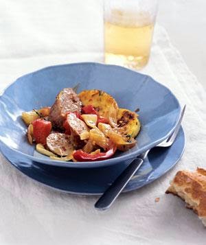 Place the polenta on a platter. Spoon the sausage, vegetables, and pan juices over the top. Serve with the crusty bread, if desired.