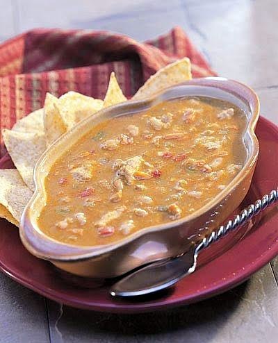 Place all ingredients except the corn chips in a crockpot. Cook on high until the cheese is melted.