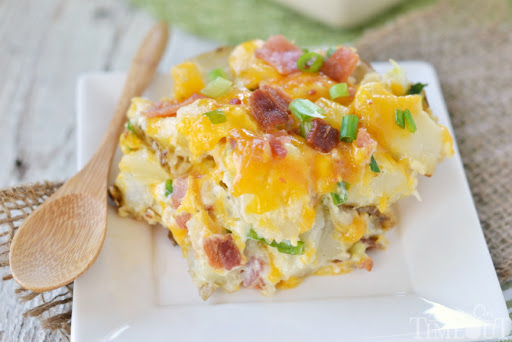 Set aside ⅓ cup cheese, 3Tbs bacon, 2 Tbls sliced green onions for the top of the casserole and stir in remaining ingredients.
