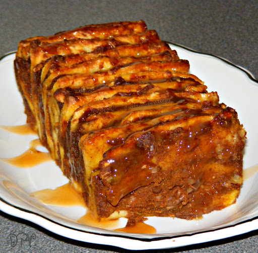 Refrigerated pizza crust dough is spread with butter and a pumpkin filling, cut into squares, then stacked into a loaf pan and baked. To serve, it's drizzled with caramel syrup/sauce then pulled off in individual servings.