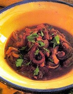 Caliente el aceite en una cazuela, y fría e! pulpo con e! resto de las cebollas durante 3 minutos. Agregue los tomates, e! azúcar, e! orégano o e! romero, e! perejil, e! vino y el vinagre, y deje hacer 5 minutos, removiendo constantemente.