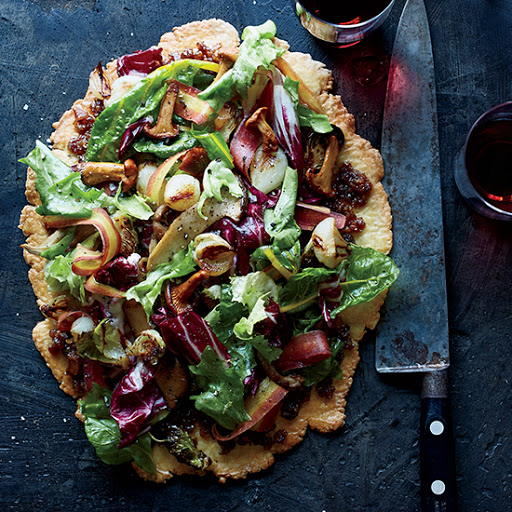 Transfer the crust to a platter and spread half of the bacon marmalade on top. In a large bowl, toss the roasted vegetables with the escarole, Swiss chard, shaved carrot and radicchio; season with salt and pepper. Pile the vegetables on the crust and serve.