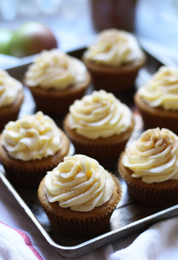 Spread or pipe frosting on cupcakes however you like and sprinkle with cinnamon and nutmeg.