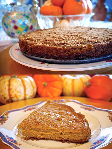Pumpkin Spice Cheesecake is made with tofu and oats, in a cookie crumb crust. Serve with a dollop of coconut whipped cream.