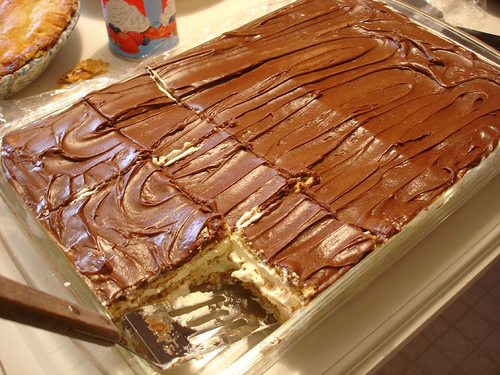 2. Cook the container of prepared frosting, uncovered in the microwave for 1 minute on half power. Pour over the top of the cake. Refrigerate for at least 12 hours before serving.