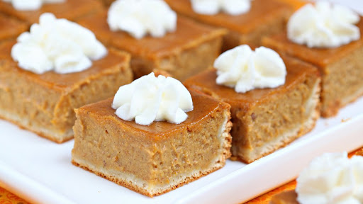5 Using hanging paper, lift from pan. Cut into 4 rows by 3 rows to make 12 bars or 4 rows by 4 rows to make 16 bars. Garnish each bar with whipped cream or a dusting of pumpkin pie spice. Store in refrigerator.