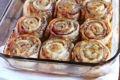 3.Next combine the butter, brown sugar, Worcestershire sauce, mustard, and poppy seeds in a sauce pan over medium heat. Whisk until the butter is melted and the glaze is smooth and combined. Pour evenly over the rolls.
