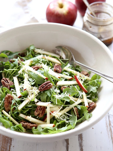 Apple Arugula Salad with Cheddar, Candied Pecans and Balsamic Vinaigrette