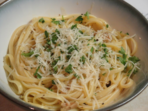 Cover pasta with clam sauce, stir well and top with parsley and parmesan cheese.