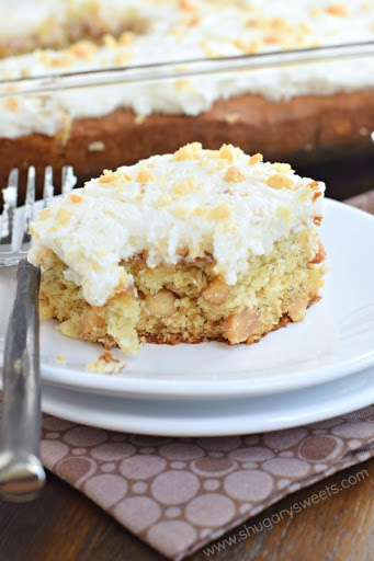 For the frosting, beat butter, vanilla, powdered sugar, and milk for about 4-5 minutes until fluffy. Spread over cooled cake and sprinkle with macadamia nut pieces. Serve and enjoy!