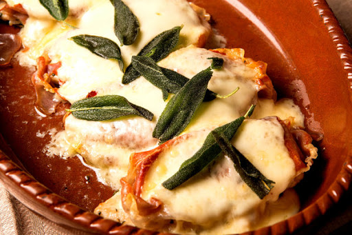 Top each piece with 2 sage leaves, a slice of prosciutto and a slice of fontina. Broil for 2 to 3 minutes, until the cheese is bubbling. Garnish with remaining sage leaves.