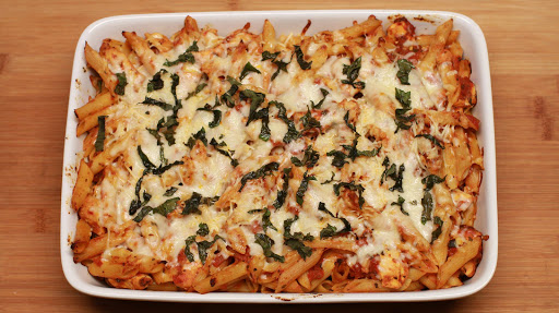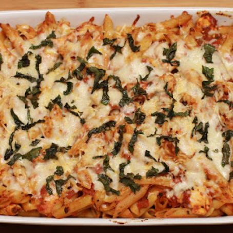 Pour half of the pasta into a greased 11x7-inch or 9x13 inch baking dish. Sprinkle evenly with 1 cup of mozzarella cheese, 1/2 cup of parmesan, 1/8th cup of basil. Layer the remaining half of the pasta evenly on top. Sprinkle evenly with the remaining cheese and basil.