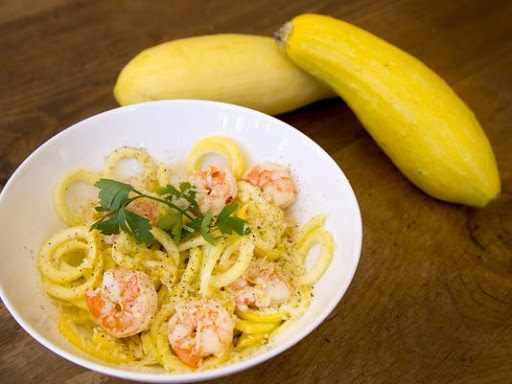 Cut off the ends of the yellow squash and then cut again at the crookneck, where the squash begins to curve. Use the large end of the squash for the noodles; reserve the smaller neck end for another use. Using the medium blade of the Spiralizer (spiral slicer for vegetables), cut the squash into noodles.