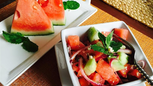 Toss watermelon, baby cucumbers, and feta cheese together in a large bowl. Pour the red onion mixture over the watermelon mixture; toss to coat. Sprinkle mint over the salad; toss.